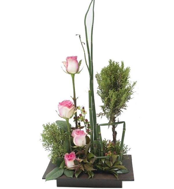Arreglo Floral con 4 rosas de exportación, sobre una bella base oriental, pino, hiperico, ruscus y equiseto. este arreglo de flores es ideal regalo para sorprender a sus seres queridos a domicilio.