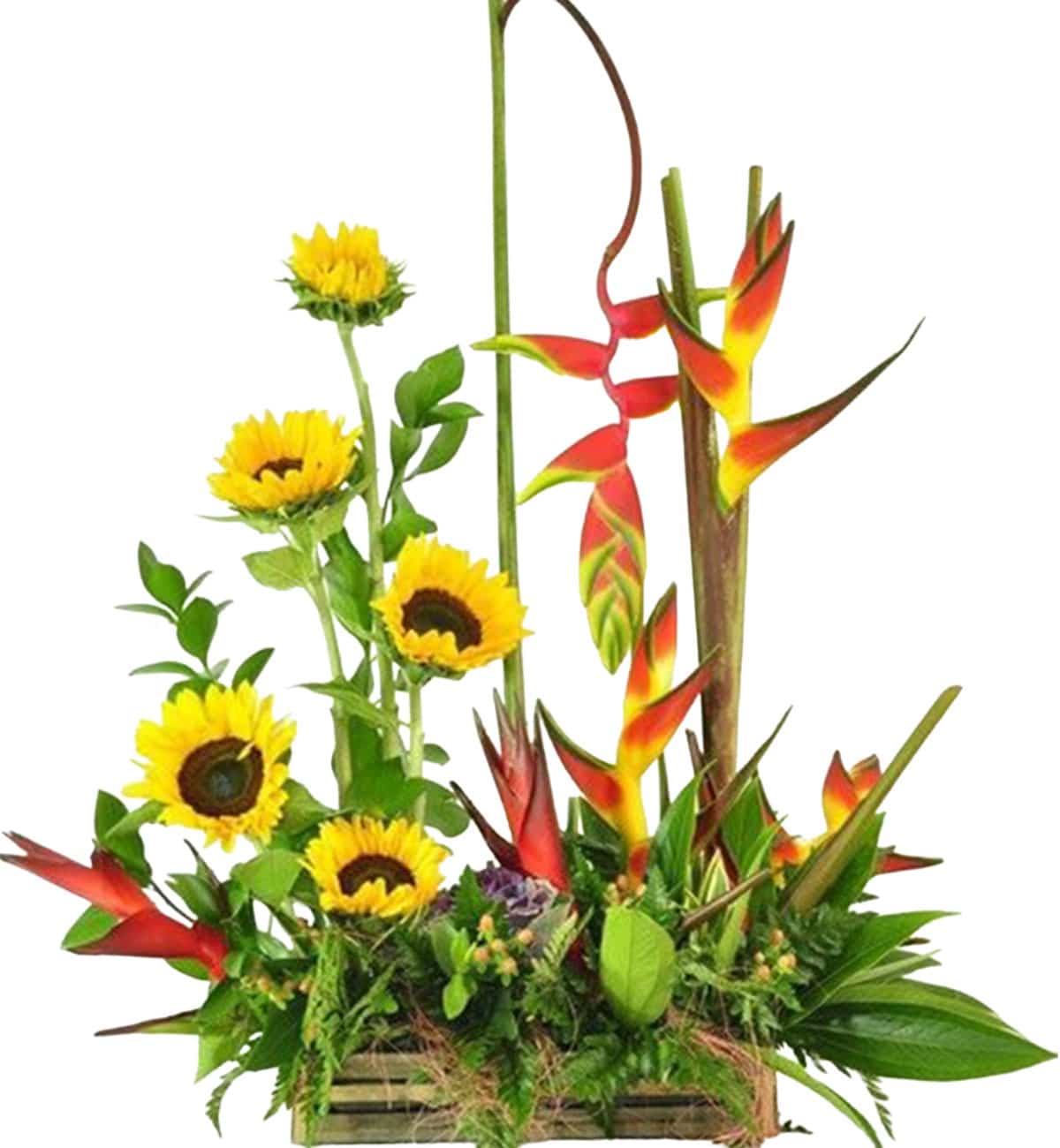 Arreglos Florales Girasol Exótico, elaborado con hermosos girasoles, heliconias, hiperico,ruscus y helecho cuero sobre una bella base rectangular.